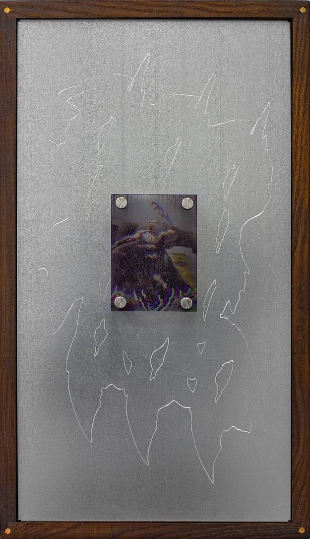 Слава Нестеров. Без названия. 2025. Металл, ручная гравировка, УФ-печать на акриле, дерево. 59х34х5