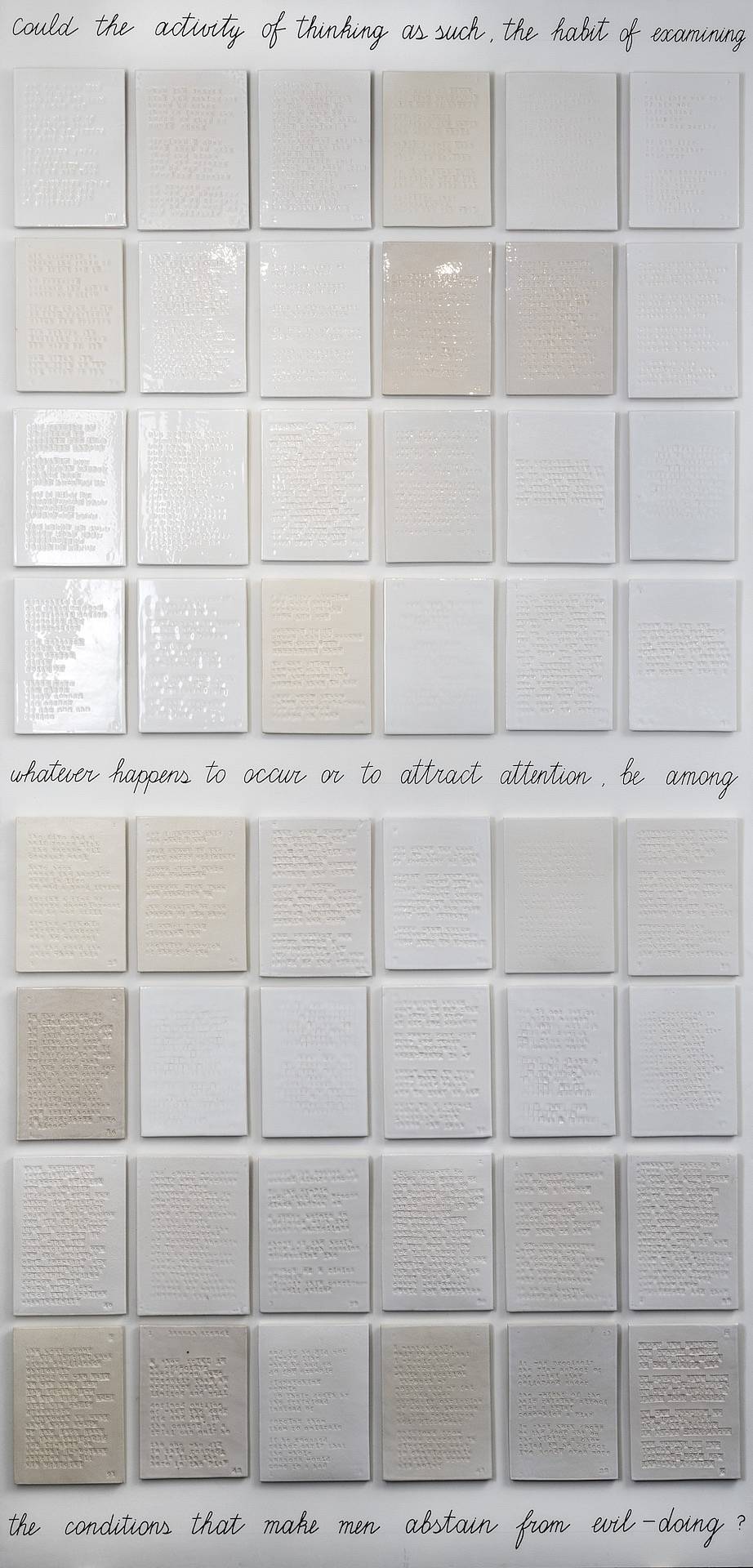 О&О Татаринцевы. Может ли мыслительная деятельность быть одним из условий, заставляющих людей воздерживаться от злодеяний? (Ханна Аренда). 2025. Шамот, глазурь, мдф, акрил, деревянный планшет. 300х150х20