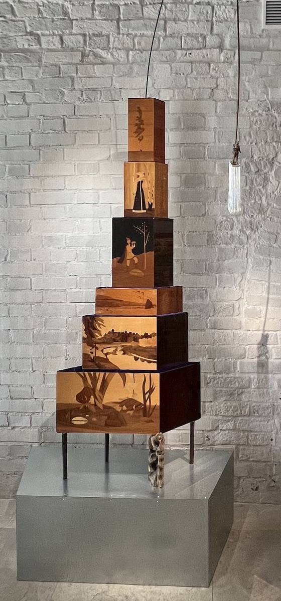 Ирина Корина. Пирамида «Циолковский». 2025. Металл, дерево, найденные объекты. 283х80х45